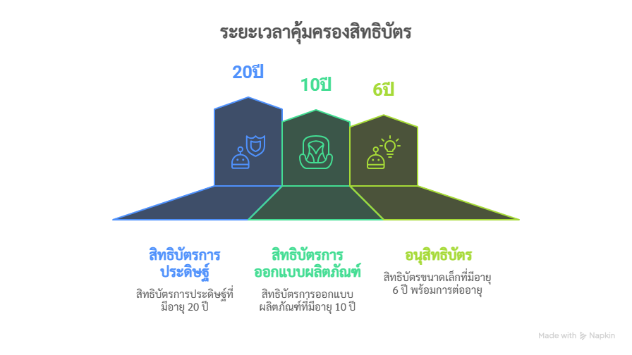 • สิทธิบัตรการประดิษฐ์ มีอายุ 20 ปี นับแต่วันขอรับสิทธิบัตร